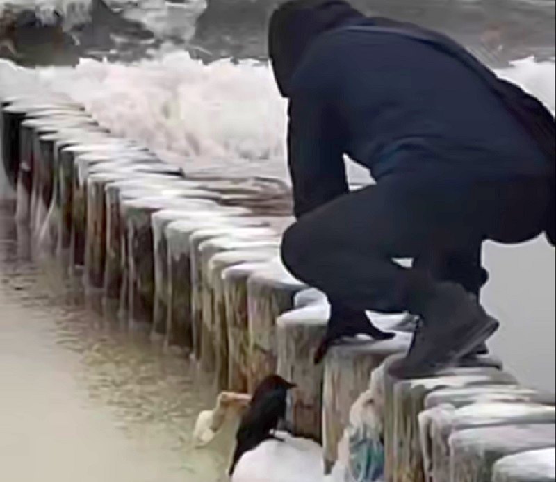 Заметивший бедолагу молодой человек залез на заледеневшие буны и пошёл к птице. Узкий скользкий «мост» оказался ещё опаснее, чем казалось с берега. Обувь скользила, но защитник добрался до своего маленького подопечного.