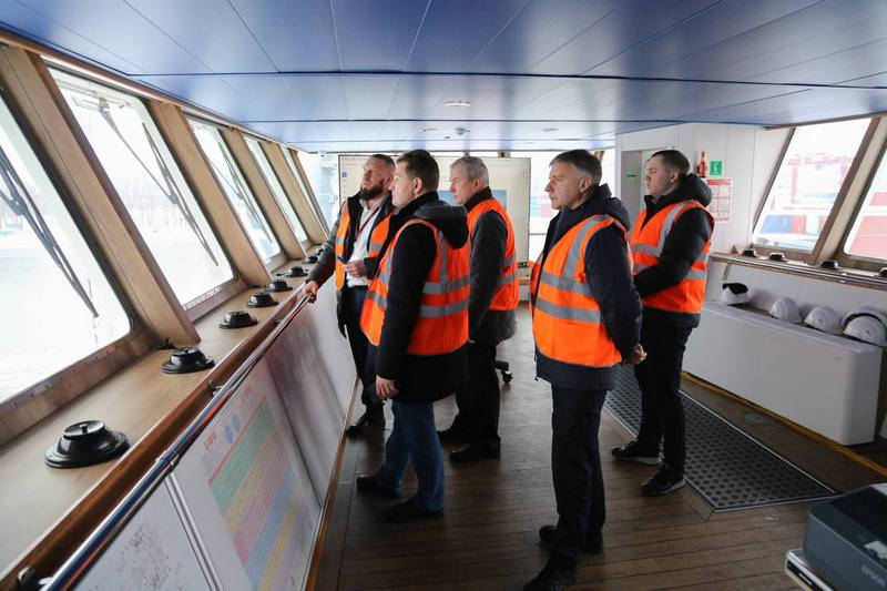 На пароме «Маршал Рокоссовский» Пылин и Иванов обсуждали расширение железнодорожных путей у портового комплекса в Балтийске, а также реконструкцию дамбы морского канала.