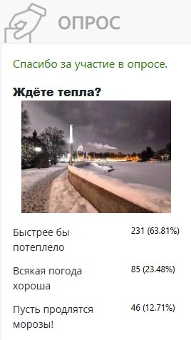 Но есть и особо закалённая аудитория: 12% желают продолжения морозной погоды. А теперь первые могут высказать последним свои претензии (шутка) за то, что намолили холода.