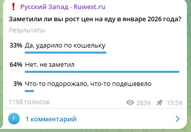 Заметим также, что даже по официальным данным Центробанка РФ в целом инфляция в январе 2026 года в России составила более 1%, что ставит под сомнение планы властей снизить суммарную инфляцию к концу года до 5%.