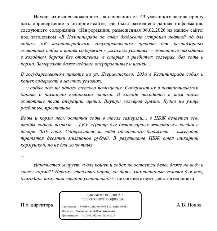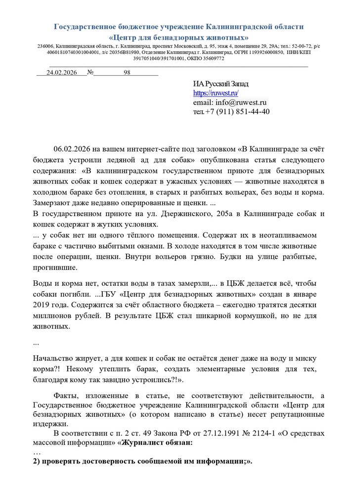 В редакцию "Русского Запада" 3 марта 2026 года обратилось ГБУ "Центр безнадзорных животных" с требованием опровержения. Редакция публикует текст письма:
