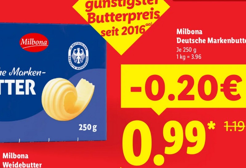 В Германии цена 1 кг сливочного масла в рамках акционных предложений в дискаунтерах докатилась до 368 рублей (упаковка 250 граммов стоит 0,99 евро, 1 евро = 93 рубля). Но даже и без акций оно стоит 1 080 рублей за 1 кг, что на 20% дешевле, чем в Калининградской области.