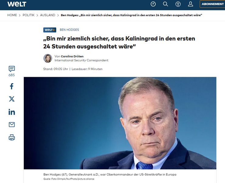 «Я, например, могу представить, что Польша сразу же участвовала бы в ударах по Калининграду», - заявил Бен Ходжес, уже известный по своим громким заявлениям.