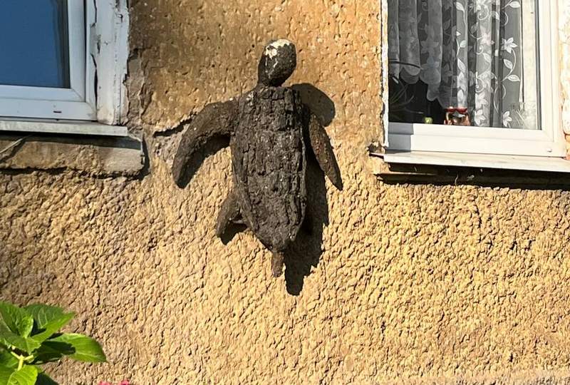 Под окном квартиры на первом этаже, на Литовском валу, 49-55 к стене было прикреплено объёмное изображение ползущей черепахи. Неожиданно то, что обычно скульптуры на немецких домах располагались со стороны улицы и чаще всего – у подъездов. Этот артефакт нельзя назвать хаусмаркой, да и вряд ли он довоенного происхождения.