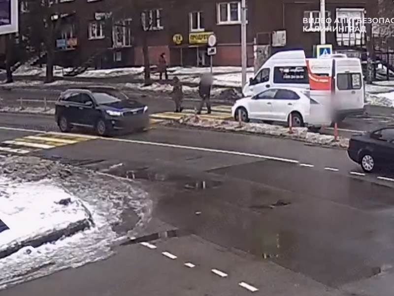 «Безопасный город» опубликовал кадры ДТП на улице Киевской в Калининграде: водитель проскакивает через пешеходный переход и сбивает человека.