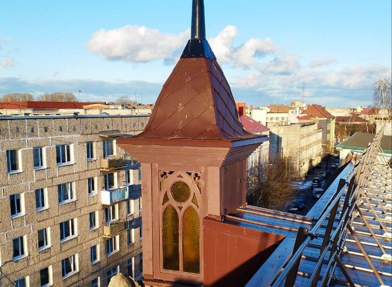 Специалисты фонда восстановили её прежний облик по фотографиям: вновь появились купол первоначальной формы и шпиль. У башенки есть три декоративных фигурных окна с витражными стёклами.