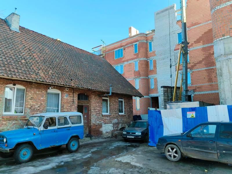 Строящийся 4-этажный дом буквально нависает над одноэтажным кирпичным домиком 1907 года постройки. Добро на уплотнение министерство градостроительной застройки Калининградской области дало как раз 13 марта 2025 года.