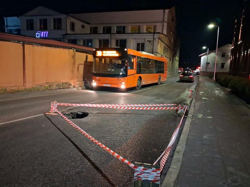 О дыре на проезжей части сообщили в группе «Автобусы Калининграда». Утром в субботу, 14 марта 2026 года, была перекрыта одна полоса для движения в сторону ул. Батальной.