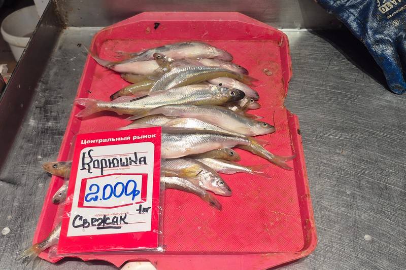 «Маленькая корюшка, свежак, 850 рублей за килограмм», — гласит один ценник. С другого прилавка продают уже по 1500, ещё и приписали: «Акция!!!». Кому и это покажется чрезмерным, стоит взглянуть на соседний лоток: 1 кг вяленой корюшки — 3700 рублей.