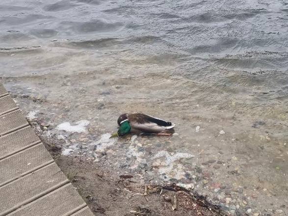 По берегам водоёма лежат десятки умерших голубей. На мелководье колышутся трупики уток. Особенно много умерших около уреза воды, со стороны сквера вдоль улицы Летней. Рядом работает уличное кафе, гуляют сотни детей и взрослых.