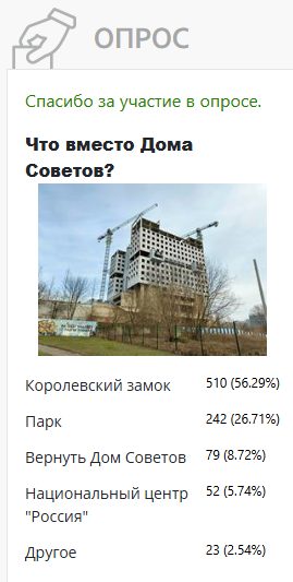 Кстати, опрос «Нового Калининграда», проводившийся чуть ранее показал практически такое же распределение голосов: 45% - за Королевский замок; 29% за парк, 7% за Дом Советов, а центр «Россия» набрал только 5% голосов.