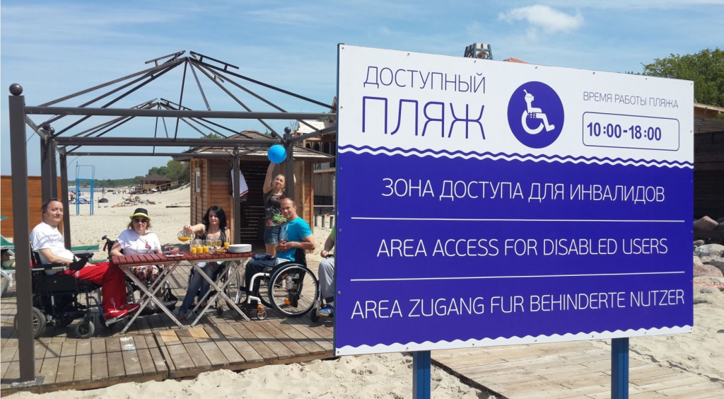 На специальном пляже оборудованы пандусы, шезлонги и раздевалка с кушеткой и поручнями, деревянная тропа и даже уютные шатры, в которых можно спрятаться в случае непогоды. Любой человек с ограниченными возможностями здоровья может воспользоваться специальными плавающими колясками и помощью волонтеров.