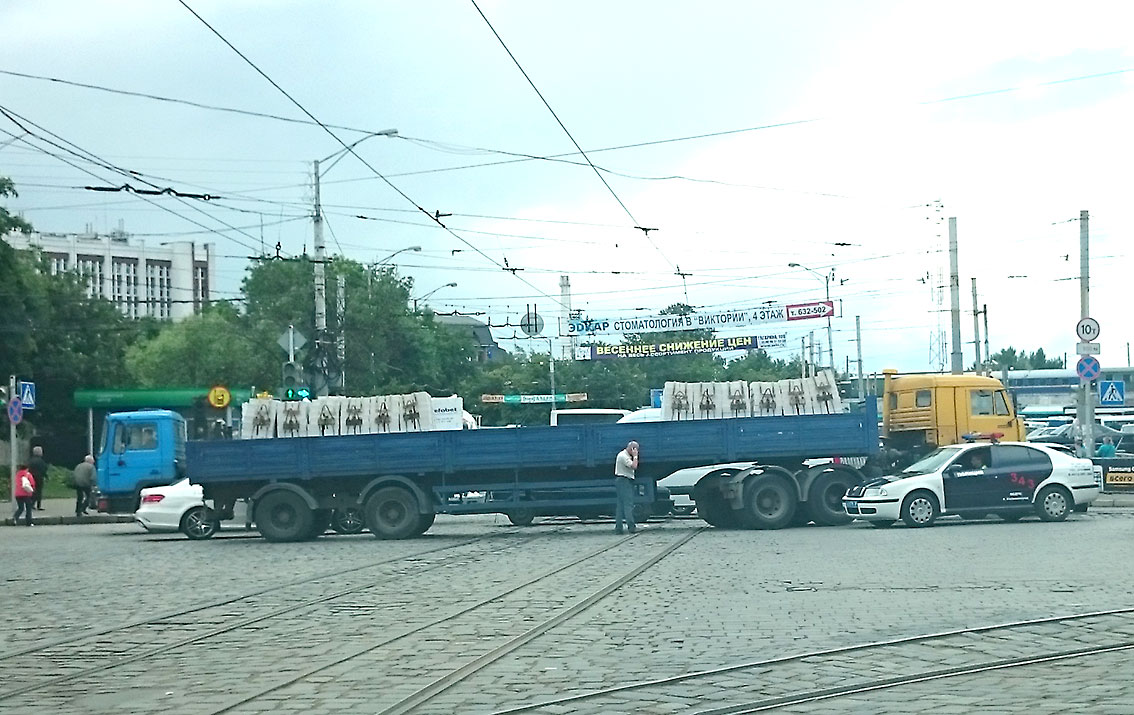 ДТП произошло на пересечении проспекта Калинина и улицы Киевской, в начале Ленинского проспекта. К счастью, никто из людей не пострадал, - сообщает народный корреспондент Русского Запада. По словам очевидца происшествия, после аварии образовалась пробка, которая тянется от Южного вокзала до улицы Судостроительной. Такая ситуация нехарактерна для этого времени суток. Обычно после полудня этот участок магистрали относительно свободен от автотранспорта.