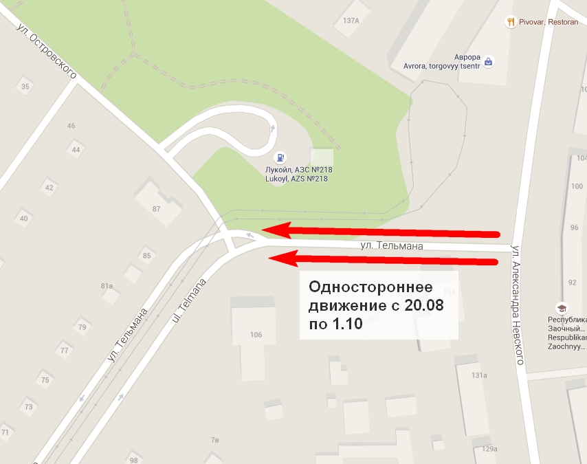 По сообщению пресс-службы городской администрации, в целях обеспечения безопасности дорожного движения при производстве работ по ремонту дорожного покрытия с 20 августа по 1 октября вводится одностороннее движение на участке улицы Тельмана в направлении от ул. А. Невского к ул. Островского.