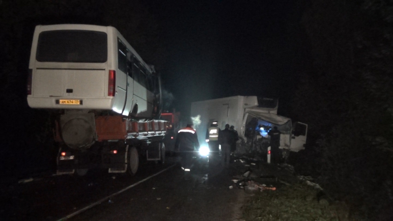 По предварительным данным, 26-летний водитель грузовика на закруглении дороги не справился с управлением, машина пересекла сплошную линию и ударила в лоб автобус.