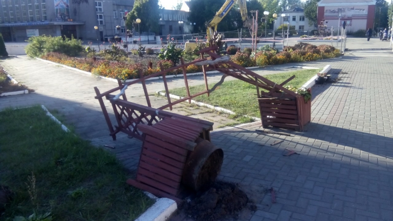 В Немане местные жители разгромили деревянную арку-цветочницу, разбили горшки с цветами, повалили на землю фонарный столб, расколов стеклянный плафон.