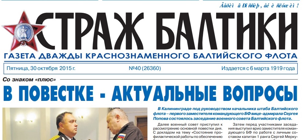 Сегодня газета "Страж Балтики" представлена лишь в интернете - на сайте Министерства обороны. В прошлом году в Калининграде отметили 95-летие газеты Балтийского флота. Она появилась в годы гражданской войны и первоначально называлась "Красный Балтийский флот". В июне 1946 года газета получила новое название - "Страж Балтики".