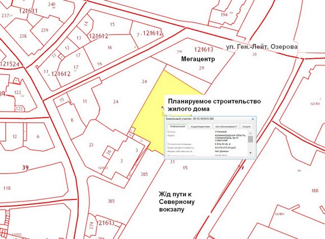 Комиссия по землепользованию и застройке администрации Калининграда даёт добро ООО «Центр» на использование земельного участка площадью 0,88 гектара к югу от торгового центра «Мега-Центр» у железнодорожных путей за Северным вокзалом под строительство многоквартирного 9-этажного жилого дома со встроенными нежилыми помещениями. Такое решение комиссия приняла по итогам состоявшихся 29 октября 2015 года публичных слушаний.