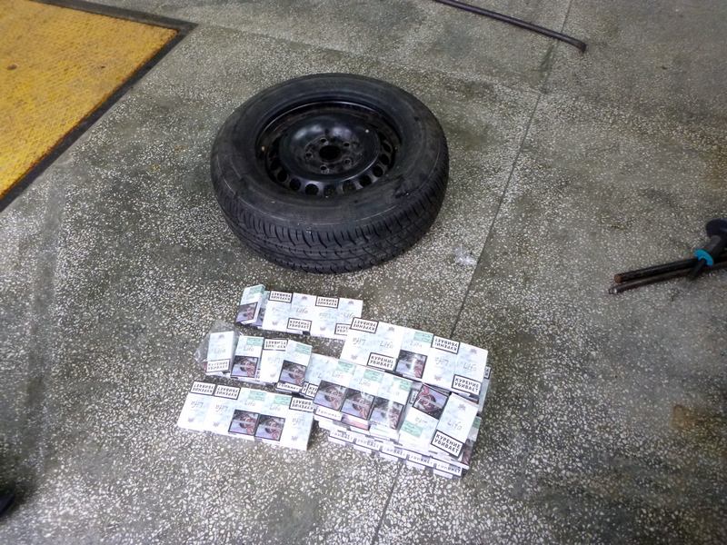 Почти 1,4 тыс. пачек сигарет общим весом 25,5 кг были обнаружены в ходе досмотра автомобиля в четырех основных колесах и одном запасном, а также в конструктивных полостях дверей.
