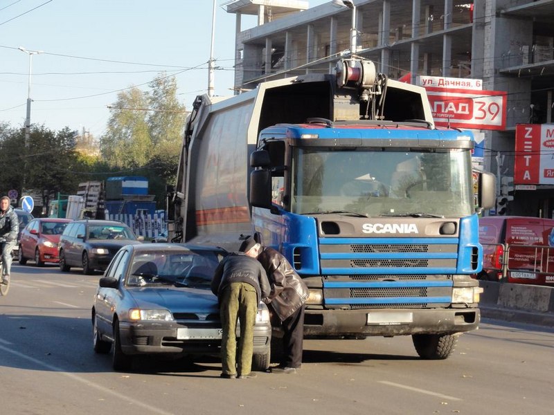 Около трех часов дня в понедельник, 17 октября 2016 года, на Московском проспекте Калининграда не поделили проезжую часть мусоровоз «Скания» и легковой автомобиль «Ниссан», из-за чего образовалась внушительная пробка.