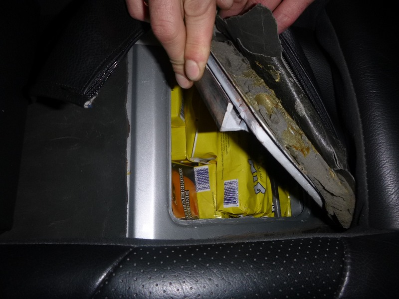 Таможенники смогли обнаружить товар только после того, как демонтировали прямоугольную металлическую пластину, находящуюся в центре боковой стенки топливного бака автомобиля, расположенного за задней пассажирской спинкой сиденья. Сигареты марки «JIN LING» в бумажной упаковке желтого цвета без акцизных марок РФ находились во внутренне полости топливного бака «Мерседеса».