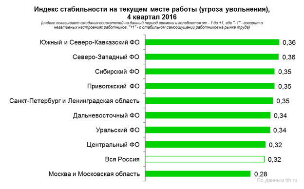 Стабильно ощущают себя и жители Южного и Северо-Кавказского федерального округа, а вот москвичи и жители Московской области высказывают самые сильные опасения за свои рабочие места.