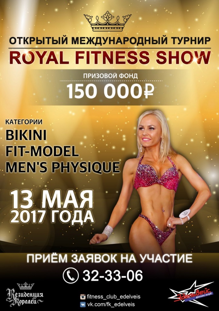 В Калининграде начинается приём заявок на участие в открытом международном турнире «Royal fitness show 2017» с денежным призовым фондом 150 000 рублей, который состоится 13 мая в новом концертно-банкетном зале «Королевский Дворик» на территории РК «Резиденция Королей». Об этом Русскому Западу сообщили организаторы турнира.