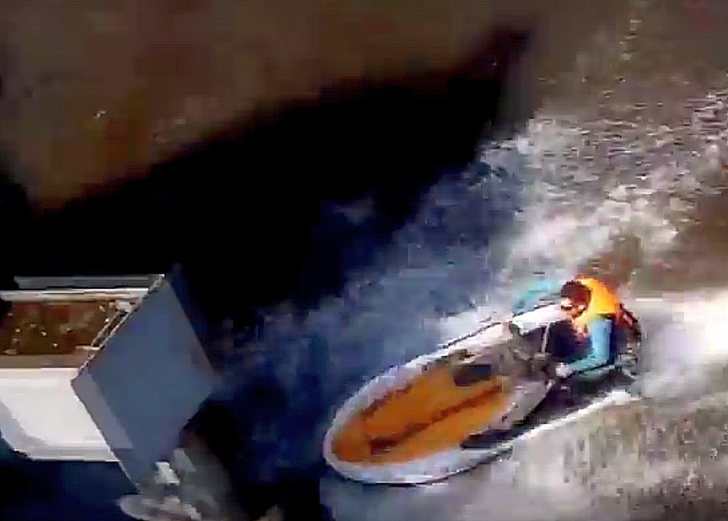 На видео видно и слышно, как к мосту (предположительно Юбилейный) по Преголе едут гидроскутеристы, подбадриваемые голосами девушек: «У, круто!»