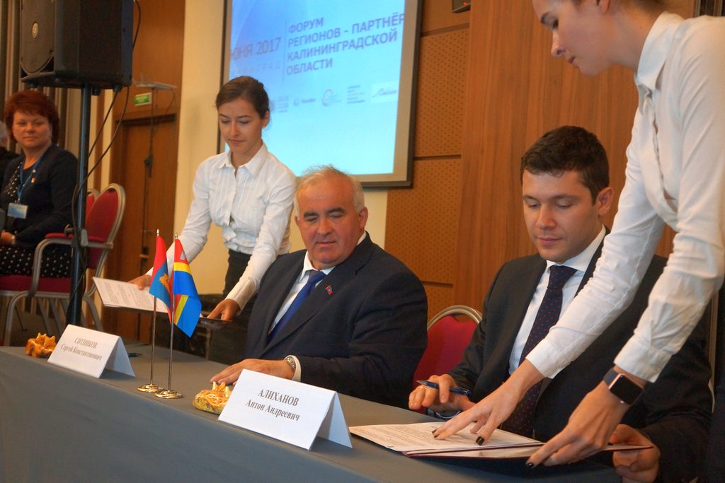 Врио губернатора Калининградской области Антон Алиханов и губернатор Костромской области Сергей Ситников подписали сегодня, 7 июня 2017 года, соглашение о сотрудничестве между регионами. Как передаёт собственный корреспондент «Русского Запада», церемония подписания прошла на полях VII Форума регионов-партнёров Калининградской области, проходящего с 6 по 8 июня 2017 года.