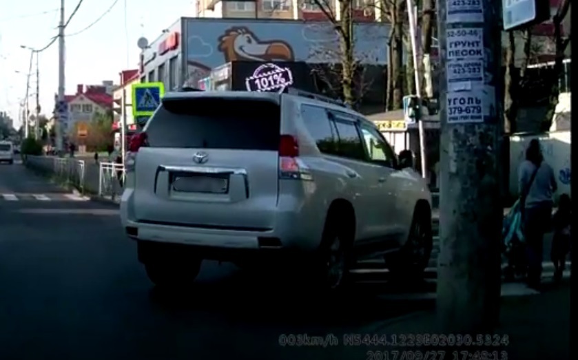 29 сентября 2017 года видео с неуступчивым белым “крузером” опубликовано в “Cообществе автомобилистов Калининграда и области” в Youtube. Ролик снят на видеорегистратор ехавшего следом автомобиля и датировано 27 сентября. Там видно, как белый LandCruiserPrado выжидает зелёный свет, чтобы свернуть с крайней полосы ул. Горького на ул. Озёрную. В это время, в том же направлении и параллельным курсом, Озёрную переходят пешеходы, последними из которых остаются трое – мать с двумя детьми и коляской. Зелёный свет для машин с Горького загорается, белый внедорожник тут же трогается с места и поворачивает на Озёрную. Авто двигается наперерез пешеходам, первый из которых случайно оказывается в паре сантиметров от капота “Тойоты”, а последние – впритирку с правым передним крылом транспорта.