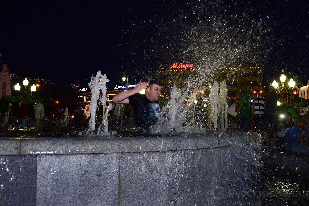 Один из стоявших на краю фонтана потерял равновесие и упал в фонтан, спиной назад. Молодой мужчина в кепке и с Fun-ID на груди попал в воду с головой. Через пару секунд он выбрался из фонтана и влез на тот же скользкий бортик с которого упал. Человек продолжил славить отечественную сборную по футболу, хотя он промок до нитки. Вода стекала с мужчины длинными струями.