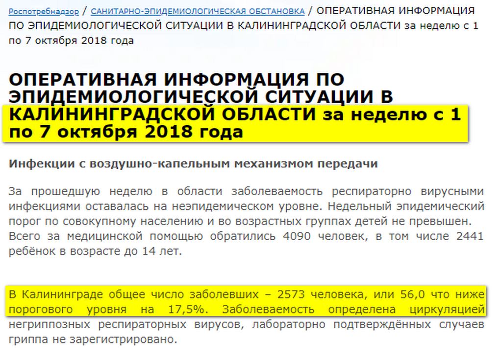 Управление Роспотребнадзора не усматривает эпидемии острых респираторно-вирусных инфекций в Калининграде по итогам своих наблюдений с 1 по 7 октября 2018 года. Как сообщает ведомство, заболеваемость в регионе «на неэпидемическом уровне».