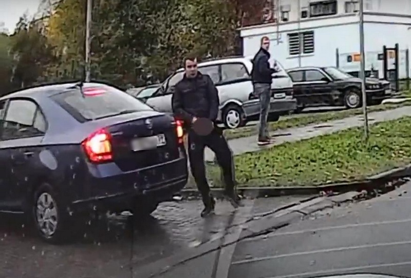 Не выдержав такого «хамства», из «Шкоды» выскакивает пассажир с уже приспущенными штанами и выставленным наружу «мужским достоинством». Перепалка продолжалась от силы секунд пять, после чего герой в спортягах вернулся в автомобиль, а другая машина повернула налево.