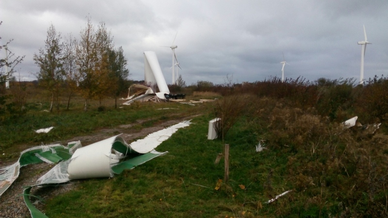 Ветер буквально раскромсал ветрогенератор, его части разбросаны вокруг.