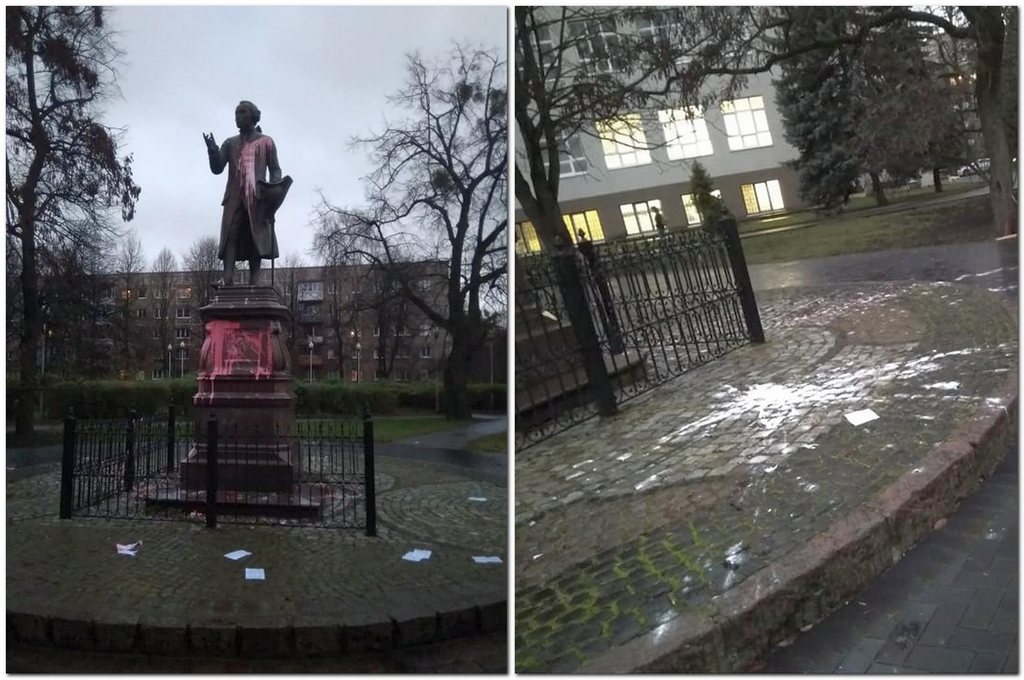 Синей и розовой краской неизвестные залили скульптуру Канта в сквере на ул. Университетской, могилу Канта у Кафедрального собора и доску на Ленинском проспекте.