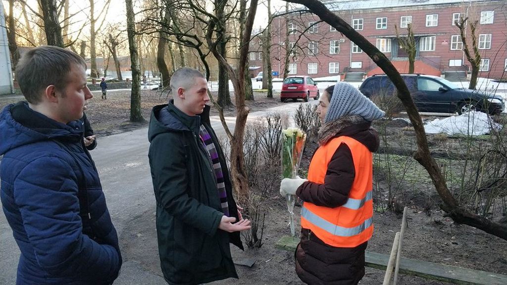 Молодежь вышла на улицы Советска рано утром. Помимо цветов, молодые люди поблагодари дворников за их тяжелый труд, который заставляет их убирать улицы и в дождь, и в снег, и несмотря на плохое настроение, раннее утро и много других факторов.