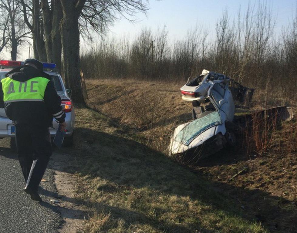 Транспортное средство вылетело с проезжей части и развалилось на две части – на фото видно, что кузов автомобиле находится в стороне от другой части автомобиля.