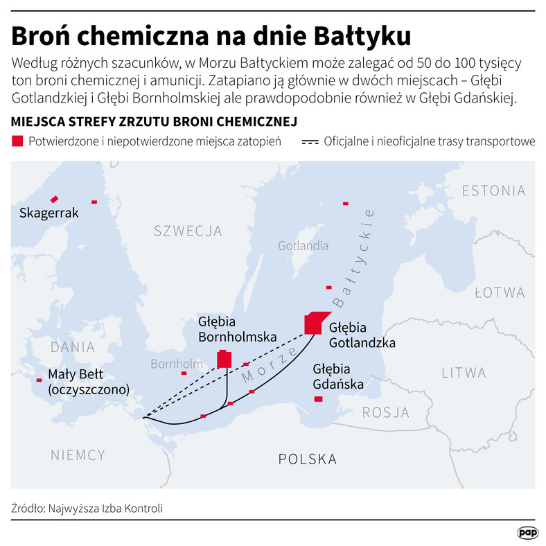 Третье место, особенно важно для Польши – это Гданьская глубина. Там с большей вероятностью находится химическое оружие. К сожалению, часть оружия была погружена в неопознанные места. Следовательно, в местах, которые считаются безопасными, может подстерегать опасность», - говорится в сообщении Палаты.