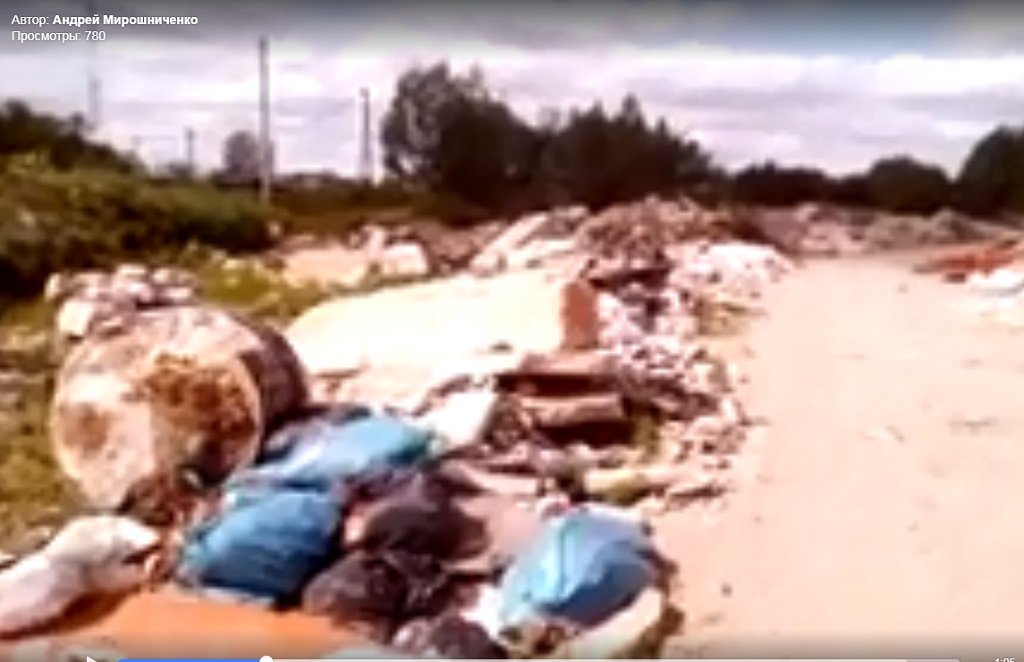 На видео снята просёлочная дорога, по обочинам которой – завалы мусора, в мешках и без. Видны обломки старых сервантов, мелкий бытовой и строительный мусор, масса пластика. У дороги дым.