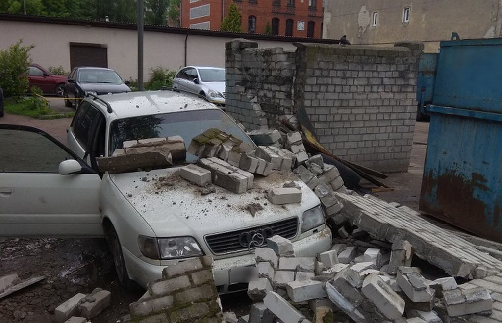 В ночь с 28 на 29 мая 2019 года на ул. Грига в Калининграде на припаркованный возле мусорных контейнеров автомобиль «Ауди» рухнула кирпичная стена.*