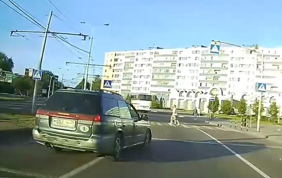 На записи с видеорегистратора видно, как водитель «Субару» даже не пытается притормозить перед пешеходным переходом – он просто ловко выворачивает руль, перестраивается на другую полосу и проходит буквально в нескольких сантиметрах от двух женщин, которые идут по нерегулируемому пешеходному переходу.