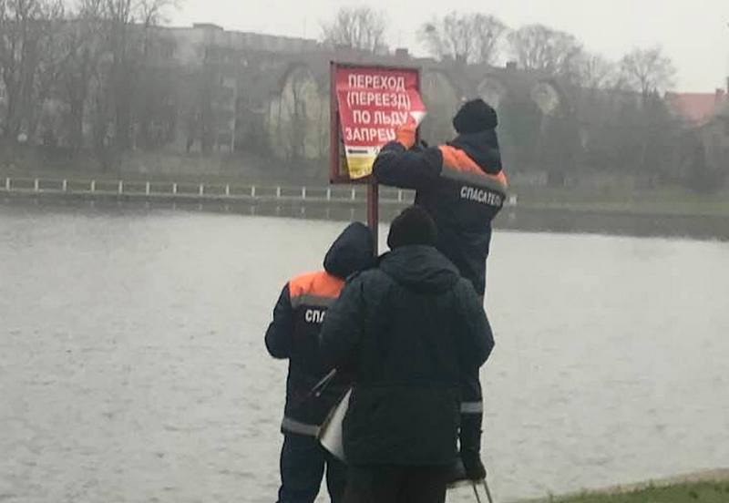 Очевидец сфотографировал у спуска к воде трёх спасателей, которые заклеивали информацию о запрете купания на запрет перехода по льду. Несмотря на то, что днём температура воздуха в конце ноября 2019 года в Калининграде не опускается ниже +3º С, сотрудники экстренной службы тщательно выполняют приказ начальства.