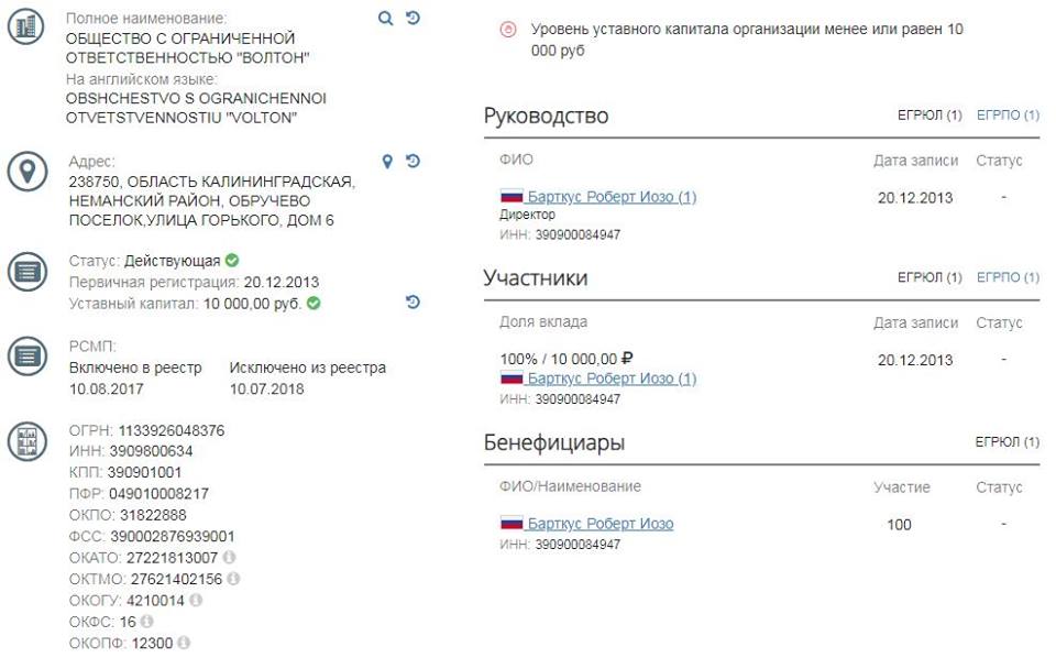 Обман вскрылся после камеральной налоговой проверки, которая выявила, что никакой поставки, а стало быть и оснований для возмещения НДС не было. По данным kartoteka.ru, ООО “Волтон” зарегистрировано на имя Роберта Иозо Барткуса.