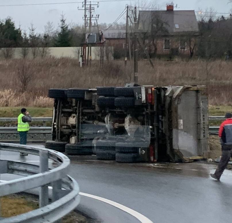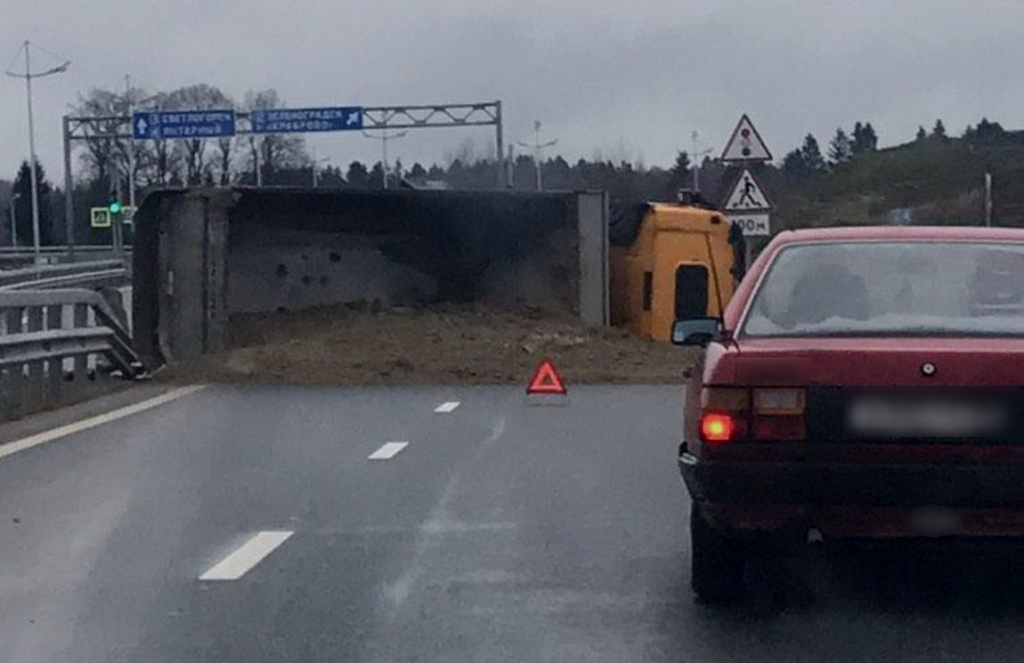 В понедельник, 13 января 2020 года, на светлогорской дороге в Калининградской области перевернулся песковоз*.