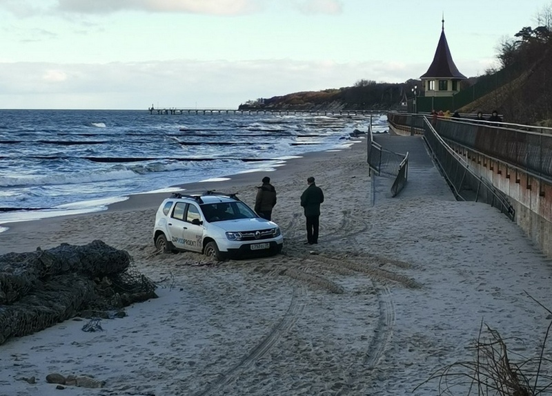 Днём в среду, 5 февраля 2020 года, на берегу Балтийского моря, в Пионерском, свидетели сняли на морском пляже джип. На авто была надпись «Запводпроект». Двери машины, похожей на Renault Duster открыты, колёса по оси – в песке. Видно, что транспортное средство сдавало назад и застряло. Рядом с автомобилем двое мужчин - предположительно водитель и пассажир.