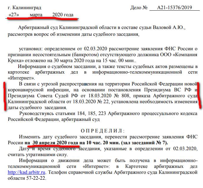 Обоснование стандартное: «В связи с угрозой распространения на территории Российской Федерации новой коронавирусной инфекции, на основании постановления Президиума ВС РФ и Президиума Совета Судей РФ от 18.03.2020 № 808, приказа Арбитражного суда Калининградской области от 18.03.2020 № 22, установлена необходимость изменения даты судебного заседания».