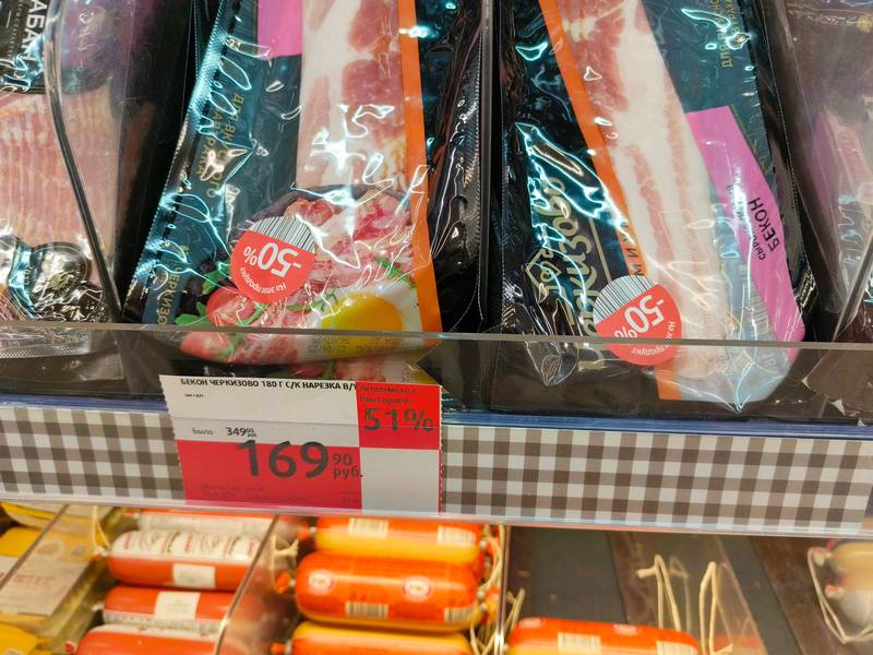 Яркий пример – супермаркет «Виктория». На ценнике за сырокопчёный бекон в нарезке марки «Черкизово» значится скидка в 51% с цены в 349 рублей за упаковку в 180 граммов. Конечная цена – 169,90 рубля за упаковку.