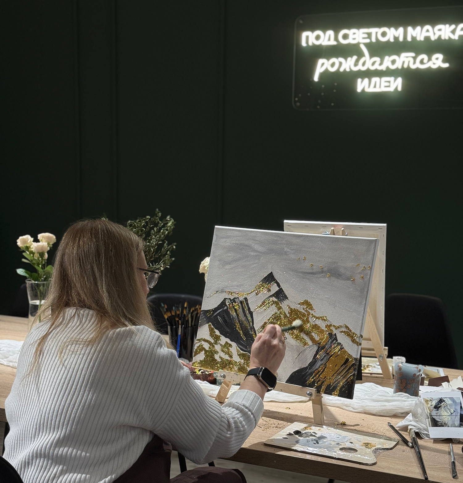 На всех занятиях присутствует наставник, который объясняет технику, подсказывает на каждом этапе и помогает справиться даже тем, кто не считает себя творческим человеком. Главное здесь — не результат, а удовольствие от процесса. И именно это ощущение уюта и вдохновения делает «Арт-Маяк» местом, куда хочется вернуться.